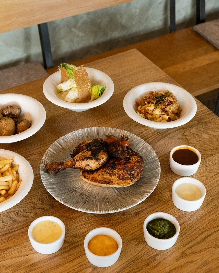 The rotisserie oven is our centerpiece. Grilled free-range chicken, Finnish flame-grilled salmon served directly on a board, Muscovy duck, spit-roasted celery. All prepared with embers, time, and love. Accompanied by sides like comforting hugs and soulful sauces.
