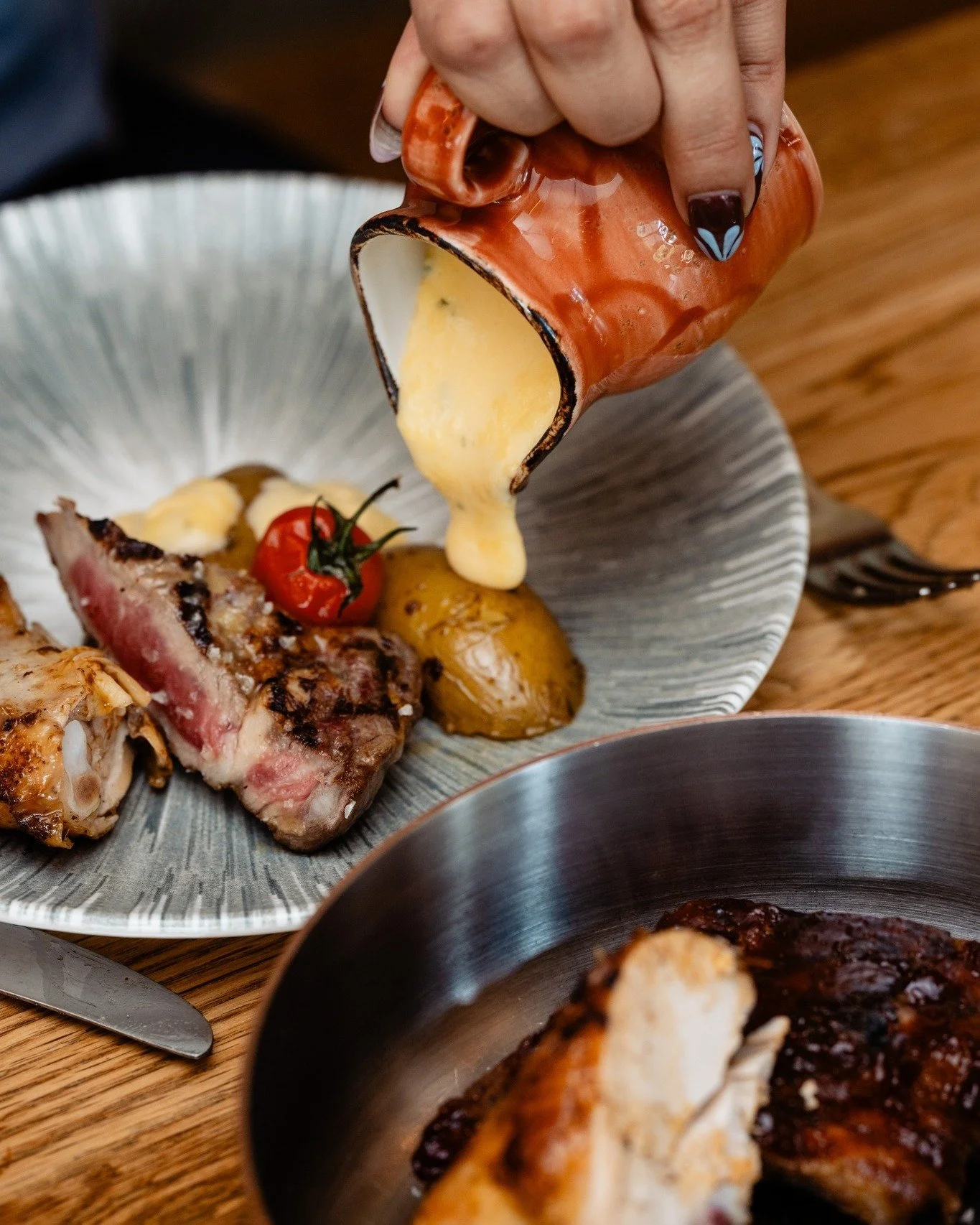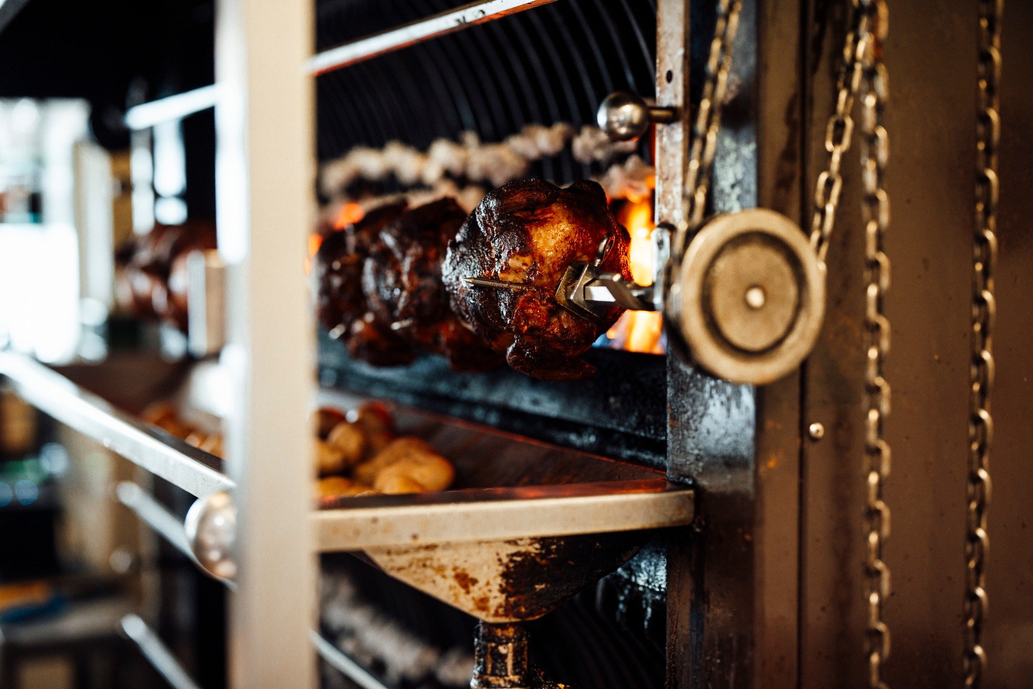 Der Rotisserieofen ist unser Herzstück. gegrilltes Landhuhn, Finnischer Flammlachs direkt aufs Brett, Barbarie Ente, Sellerie vom Spieß. Alles mit Glut, Zeit und Liebe. Dazu Beilagen wie Umarmungen und Saucen mit Seele.